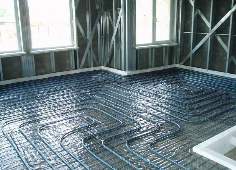 Наиболее популярен вариант теплого пола, когда в толстую бетонную стяжку вмонтированы трубы с теплоносителем. Такая конструкция эффективна и экономична.